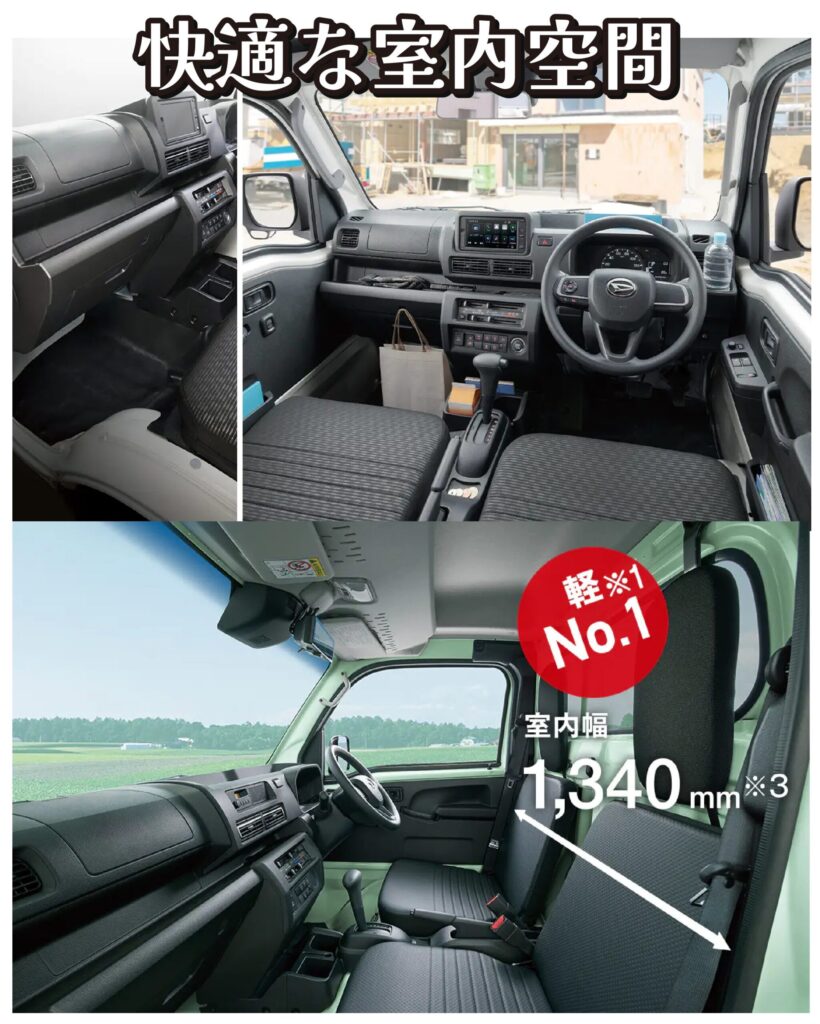 特に 室内幅1,340mm は軽トラックトップクラスで、作業着のままでもゆったり座れる快適な設計です。