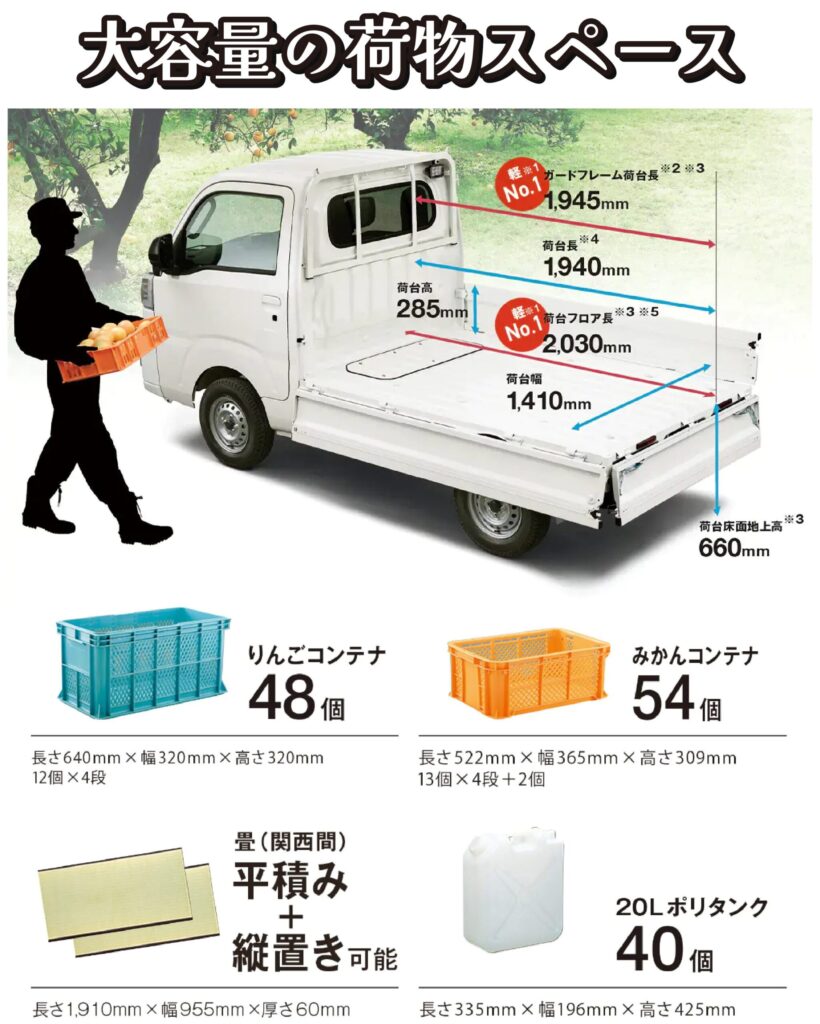 ハイゼット最大の魅力とも言えるのが、圧倒的な荷台の広さと積載力です。